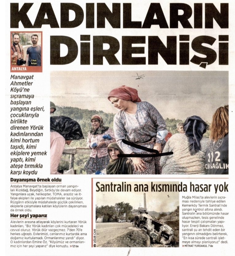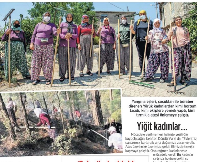 Unutulmasın ki sadece köyü kurtarmadılar aynı zamanda büyük Manavgat yangını Ahmetler'de böyle durdurulmuştu. Gazeteler, televizyonlar, bütün medya Ahmetlerli kadınların mücadelesini yukarıdaki resimlerde görüldüğü gibi ilk sayfalardan vermişti.
